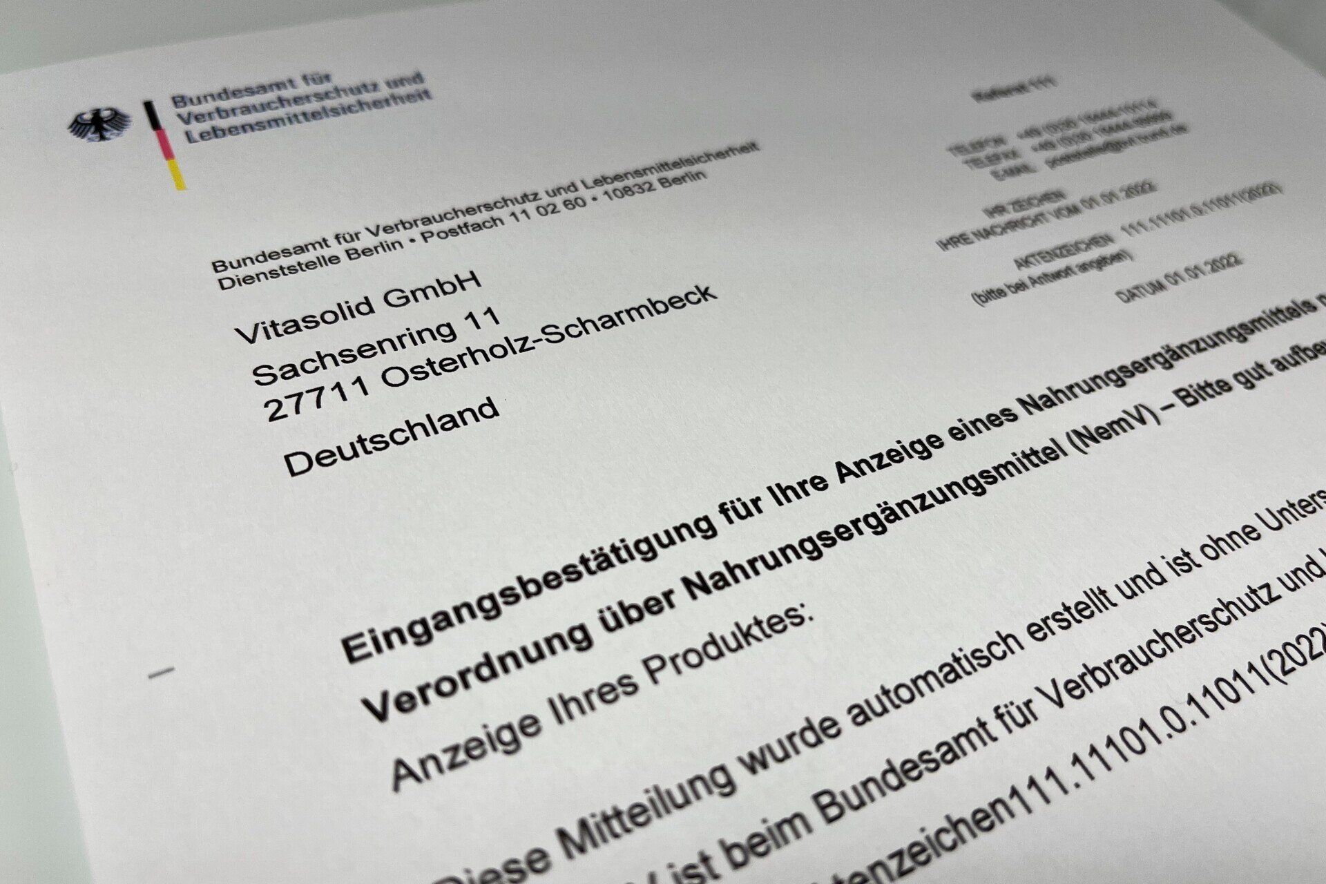 Wir bieten Ihnen als Teil unserer Leistungen gerne an, Ihr Produkt nach der Verordnung über Nahrungsergänzungsmittel beim Bundesamt für Verbraucherschutz und Lebensmittelsicherheit (BVL) anzuzeigen.